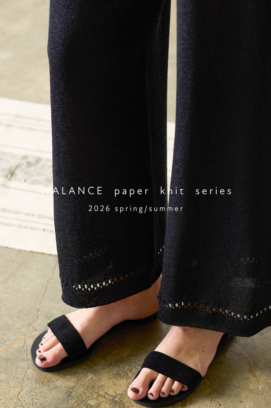 ◆DESIGN落ち感のあるシルエットが脚のラインをすっきりと整え、ニットならではのリラックス感をモードに昇華させたロングパンツ。ウエストはゴム仕様で快適に。シンプルで洗練された表情は、きれいめにもカジュアルにも自在にスタイリング可能です。同シリーズのトップスやカーディガンと合わせれば、都会的なセットアップスタイルが完成します。 ◆FABRICWALANCE人気の「和紙ニット」日本の伝統素材「美濃和紙糸」と、コットンやレーヨンを掛け合わせ、軽さ・通気性・ドライタッチを実現した素材。天然由来の消臭性と速乾性を備え、汗ばむ季節も快適。軽やかな透け感とハリ感が、日常から旅先まで洗練された表情を演出します。 日本の伝統素材「美濃和紙」から生まれた繊維と、コットン・レーヨンをブレンドした素材。和紙特有の軽やかさとドライな肌触りが、肌に心地よく寄り添い、盛夏でも涼やかな着心地を叶えます。ほんのりとしたハリ感がシルエットをきれいに保ち、ナチュラルな表情の中にモードなニュアンスをプラス。WALANCEの夏の定番として愛され続ける、上質で機能的なニット素材です。 made in China model H:179cmstaff H:166cm 2026 SS